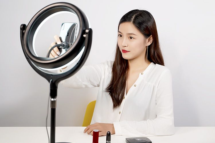 环形的补光灯是目前大家普遍使用(yòng)的,可(kě)调节光(暖光、白光、柔光),俗称美颜灯,大小(xiǎo)一般在10寸—18寸之间,根据直播场景选择。建议选择暖光和柔光比较好。补光灯也是為(wèi)了让人看起来更加立體(tǐ),让直播间更加的柔和以及有(yǒu)足够的光線(xiàn),让主播和产(chǎn)品(带货主播会有(yǒu)产(chǎn)品展示)看起来更加上镜。